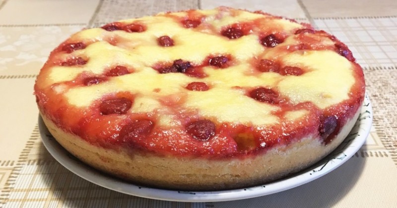 - После чего выливаем поверх тесто и накрываем вишней, которая осталась.