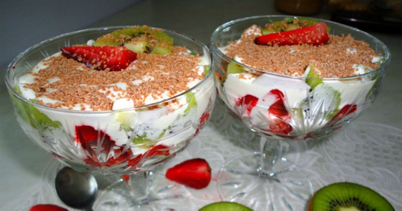 - В креманку выложите на дно слой клубники, полейте ее кремом, добавьте слой киви и опять крем. Сверху всё посыпьте тертым шоколадом.