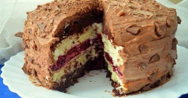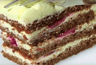 Торт очень хорошо пропитывается и получается сочным, но при этом отлично держащим форму. На вкус — не чрезмерно сладкий, с небольшой кислинкой от вишневого желе.