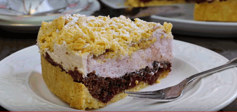 Следующим слоем посыпать тертым светлым тестом.