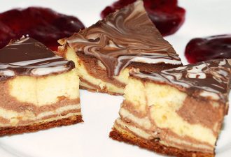 Пирог достаем из духовки и наносим полоски абрикосового повидла и взбитых белков.