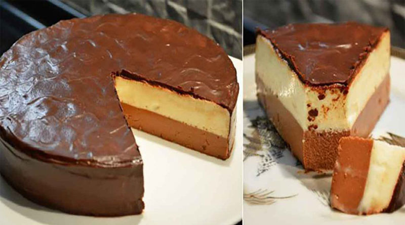 Достать из холодильника форму с застывшим белым слоем и вылить на него – шоколадный.
