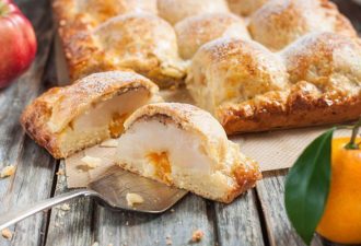 Начинку кладем у основания треугольников и сворачиваем рогаликом, слегка растягивая в стороны