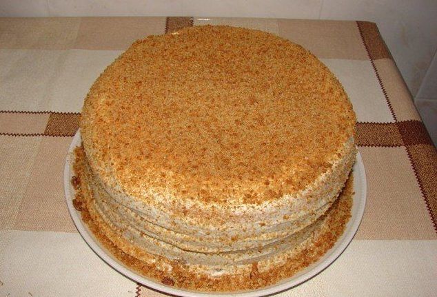 Готовые коржи разрезать на несколько коржей и промазать кремом.